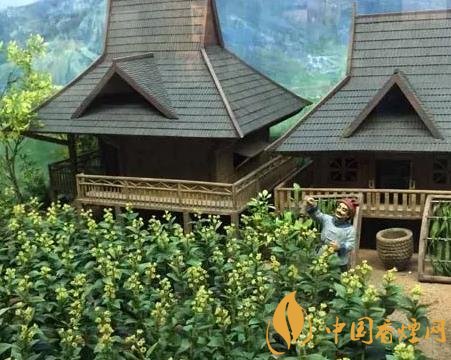 在中國(guó)煙草博物館農(nóng)業(yè)館中,有一個(gè)以云南吊腳樓為背景設(shè)計(jì)的雕塑場(chǎng)景,展示了香料煙在當(dāng)?shù)胤N植(如圖)、采摘、曬制、分級(jí)加工的過程。