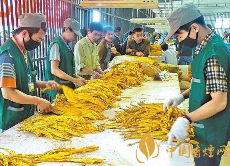 集中分級加工方式。煙農(nóng)自行組織烘烤,烤后煙葉由合作社組織專人進行去青去雜,煙站對照工商交接樣品按部位進行定級、過磅、結(jié)算。此模式的優(yōu)勢是減少分級環(huán)節(jié)用工成本,確保等級純度。