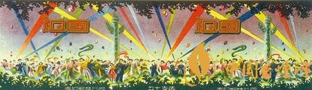 而貴陽煙草公司出品于上世紀(jì)50年代的“祖國”煙標(biāo)(圖4),主版采用明快色調(diào),描繪出了新中國成立后人民當(dāng)家作主的喜悅之情:只見各族人民身著節(jié)日盛裝,在彩球飄飄、五顏六色的射燈光柱直射天空背景襯托下,聚集于天安門前的華表周圍,在撼天動地的鼓樂聲中載歌載舞,盡情地歡慶新中國的誕生。