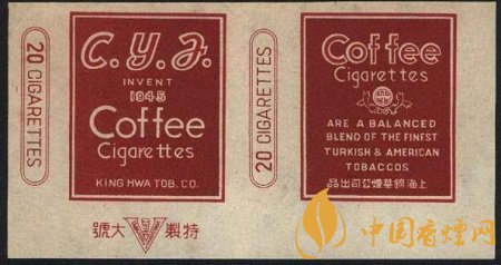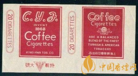 這張煙標(biāo)在白底色上做文章,正標(biāo)上是深赭色長(zhǎng)方框,正標(biāo)兩旁印有兩個(gè)紅雙線兩端弧形的長(zhǎng)方框,內(nèi)寫有紅色“20 CIGARETTES”,即為20支一包的卷煙規(guī)格。副標(biāo)印有咖啡的英文單詞,其下一個(gè)向上半開的花邊圓弧框內(nèi)有個(gè)白色圓圈,圈內(nèi)是豎寫的中文字“咖啡”,字體很小,不仔細(xì)看難免忽略。副標(biāo)下半部分則有一段全英文產(chǎn)品介紹“ARE A BALANCED BLEND THE FINEST TURKISH & AMERICAN TOBACCO”,譯為“該產(chǎn)品平和摻入了一流的土耳其和美國(guó)煙草。”底部為中文字“錦華煙廠出品”。“Coffee Cigarettes”英文字占據(jù)了整張煙標(biāo)的大部分空間,絕對(duì)奪人眼眸。