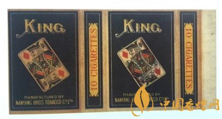 二十世紀(jì)三十年代,南洋兄弟煙草公司出品了“王牌”卷煙。這張煙標(biāo)長146MM,寬74MM。“王牌”即“KING”,撲克牌“K”牌面。該卷煙標(biāo)正版與副版的圖案一模一樣,煙標(biāo)中央向左傾斜45度的一張方塊“K”撲克牌,其上寫有大大的金色英文字母“KING”,其下為南洋兄弟煙草公司出品的英譯文。整幅煙標(biāo)沒有一個(gè)中文字,左右騎縫處則各印有紅色的“10 CIGARETTES”,即該卷煙規(guī)格為十支裝。方塊“K”牌面,就是凱撒大帝(朱利葉斯·凱撒),為羅馬共和國終生的執(zhí)政官,后出任高盧總督。四張花色的“K”牌面,南洋公司為何只取其方塊花色呢?因?yàn)樵谒膹埢ㄉ?ldquo;K”中,只有這張方塊“K”為凱撒大帝手持戰(zhàn)斧的側(cè)面像,其余三張人物均為正面像??赡軓S商是為了標(biāo)新立異,從中亦能投射出其生產(chǎn)的卷煙與眾不同吧。如此設(shè)計(jì)的煙標(biāo),握于手掌,更像是拿了一副撲克牌,雌雄難辨,頗有玩味。
