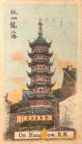 浙江杭州龍江塔何時(shí)始建暫時(shí)無(wú)考,從畫(huà)面上可以看出是一座七級(jí)八面的精美古塔。可惜,現(xiàn)在這座古塔已蕩然無(wú)存,我們也只能從這張小小的煙畫(huà)上來(lái)領(lǐng)略這座古塔的風(fēng)韻。