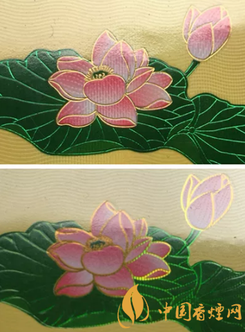 真品卷煙商標(biāo)紙上的荷花花瓣采用漸變技術(shù),顏色由粉紅色向白色過(guò)渡,花蕊處金色線條清晰,圖案印刷自然協(xié)調(diào),立體感強(qiáng);假煙采用普通仿制技術(shù),顏色搭配較為死板,花蕊處金色線條模糊、擠成一團(tuán),圖案印刷粗糙、立體感差。