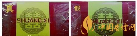 如圖所示:真品商標(biāo)紙顏色為深紅色,正面喜字燙金邊緣凸起感明顯;假煙商標(biāo)紙顏色多為鮮紅色,正面喜字為平版印刷且邊緣未見凸起感。(左真右假)