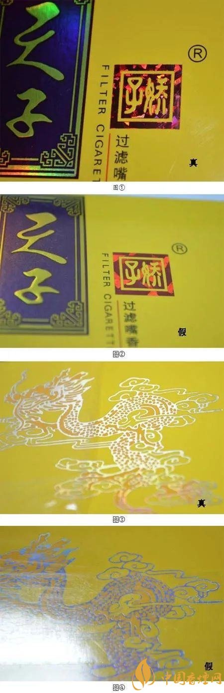 “天子”兩字。真煙顏色純正,清晰無(wú)雜質(zhì);假煙則常有粘連、雜質(zhì),顏色漸變褪色。
