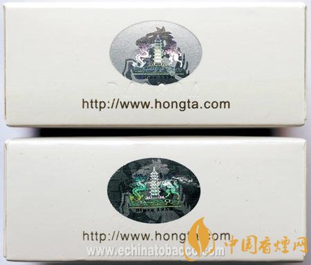 背面商標(biāo)紙印刷工藝差異對比:真品商標(biāo)紙采用白卡紙,凹印印刷,“Hongtashan”字體用手摸沒有凹凸感,“紅塔”左邊上下兩朵云距離塔身較遠;假煙采用高清掃描仿制印刷,“Hongtashan”字體用手摸有凹凸感,“紅塔”左邊上下兩朵云離塔較近,與真品特征存在明顯差異。