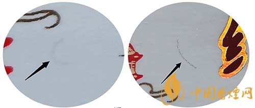 假冒卷煙:該款假冒卷煙彩色纖維絲清晰,纖維絲印刷在商標(biāo)紙表面。圖4左真右假