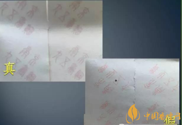 條盒底紋采用絲網(wǎng)印刷,墨層厚,觸摸有明顯的凹凸感,色澤亮麗。下圖側(cè)看真假對(duì)比效果。