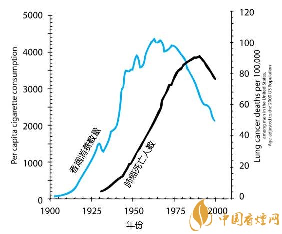 大家一看這個圖,就會發(fā)現(xiàn)吸煙數(shù)量和肺癌死亡數(shù)量的曲線幾乎一模一樣,但有大約25年的滯后:吸煙增加,肺癌會在25年后相應增加,吸煙減少,肺癌也會在25年后相應減少。這個奇特的滯后主要是因為肺癌發(fā)生是個非常慢的過程,從癌前變異,到早期癌癥,到晚期癌癥,一般需要10~20年時間。