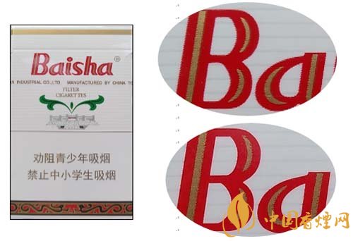 假冒卷煙:背面Baisha拼音字母膠印,紅色與白色交界位置無(wú)鋸齒痕跡。