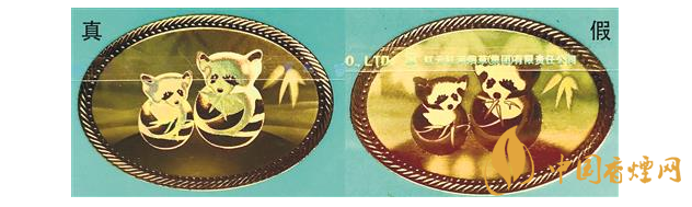 鐳射防偽標識差異對比:真煙鐳射防偽標識清晰、無漏色,竹葉葉片清晰光滑無條紋,兩只小熊貓身上和頭頂?shù)拿旨毦鶆?;假煙鐳射標識粗糙模糊,竹葉葉片有條紋狀,兩只小熊貓有漏色,身上和頭頂?shù)拿植诓痪鶆颉?/p>