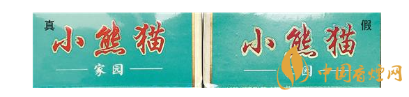 正面文字差異對比:真煙“小熊貓”字樣字體較粗,字形渾厚有力,凸起明顯,燙金緊湊均勻;假煙“小熊貓”字樣字體較細,似連似斷,凸起不明顯,邊緣燙金較寬。