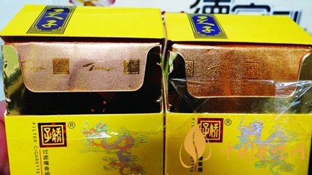 小盒商標(biāo)印刷工藝差異對(duì)比:真品小盒正面套印定位燙金“飛龍”圖案鱗片清晰,從頭至尾都能看到定位燙金工藝,紅色貫穿整個(gè)龍身,“鱗片”是雪里透紅,栩栩如生;假煙套印定位燙金仿制較差,鱗片無(wú)法達(dá)到真品的印刷工藝水平,印刷工藝與真品商標(biāo)圖案差異明顯。