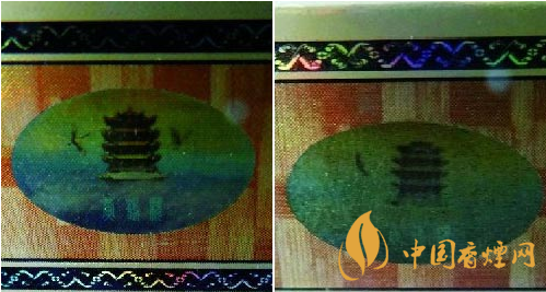 小盒商標(biāo)紙側(cè)邊雙重全息定位燙技術(shù)差異比對(duì):真品小盒側(cè)邊雙重全息定位燙技術(shù)的圖案由黃鶴樓實(shí)景照及黃鶴樓三個(gè)燙金字組合,切換不同角度會(huì)呈現(xiàn)出清晰較高全景圖案;假煙定位燙圖案多采用照相等仿造技術(shù),無(wú)論如何切換不同角度都不能完整性呈現(xiàn)清晰圖案,與真品呈現(xiàn)效果差異明顯。