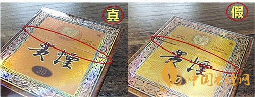 假冒:非常粗糙,方向錯位,位于煙盒的左側(cè)。