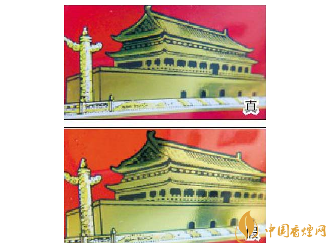 1.小盒正面商標(biāo)紙?zhí)咨珷C金工藝對比:真煙天安門左側(cè)華表套色均勻,黃白色分布有明顯分界點,邊緣光滑、干凈、清晰;假煙套色較差,黃白色不明顯,黃色部分印刷較分散,字體邊緣套印有毛渣點,呈現(xiàn)鋸齒狀。