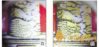3.小盒背面華表底座微縮印刷工藝差異對比:真煙微縮防偽印刷圖案效果呈現(xiàn)主次分明、清晰度高、套印準(zhǔn)確的特點;假煙采用照相或掃描的方法仿制,字體及圖案變形增大,無主次感,微縮字體及圖案比較粗糙,呈現(xiàn)出來的效果是模糊不清的。