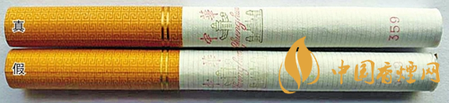 煙支印刷差異對(duì)比:真煙煙支過濾嘴上的兩個(gè)金色圓圈較寬;假煙煙支過濾嘴上的兩個(gè)金色圓圈較窄。