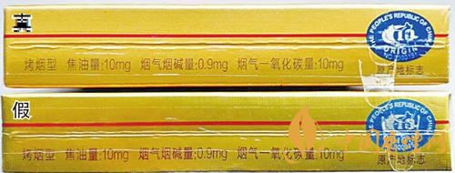 正面商標(biāo)紙印刷工藝差異對(duì)比:真煙商標(biāo)紙采用壓凸?fàn)C金工藝,中間天安門圖案用手摸凹凸感明顯,且天安門城墻上有細(xì)密的橫線條;假煙采用高清掃描仿制印刷,中間天安門圖案用手摸凹凸感不明顯,且天安門城墻上沒有橫線條。